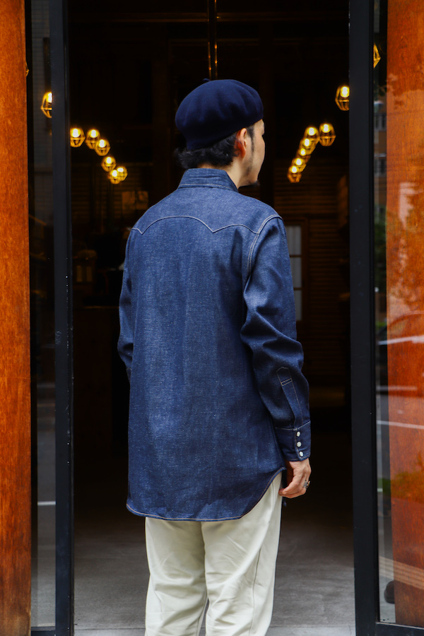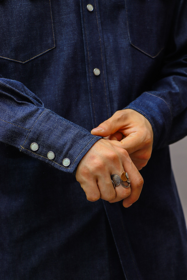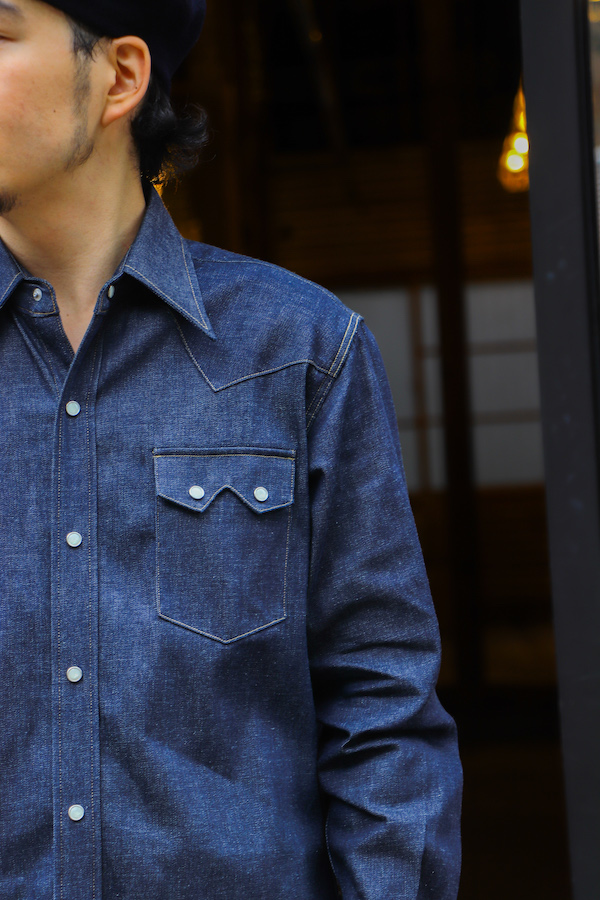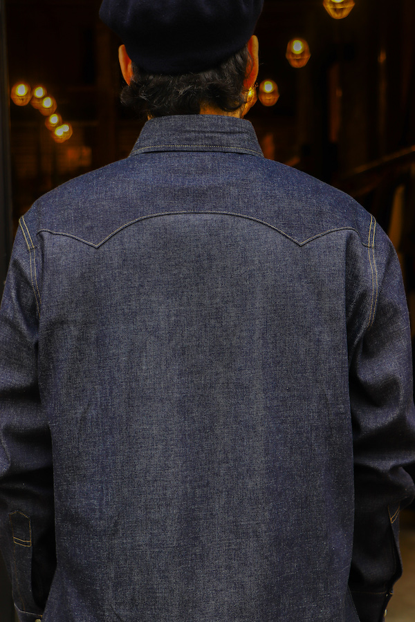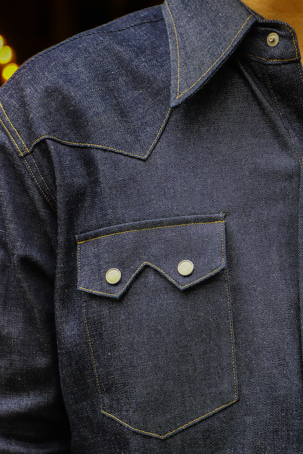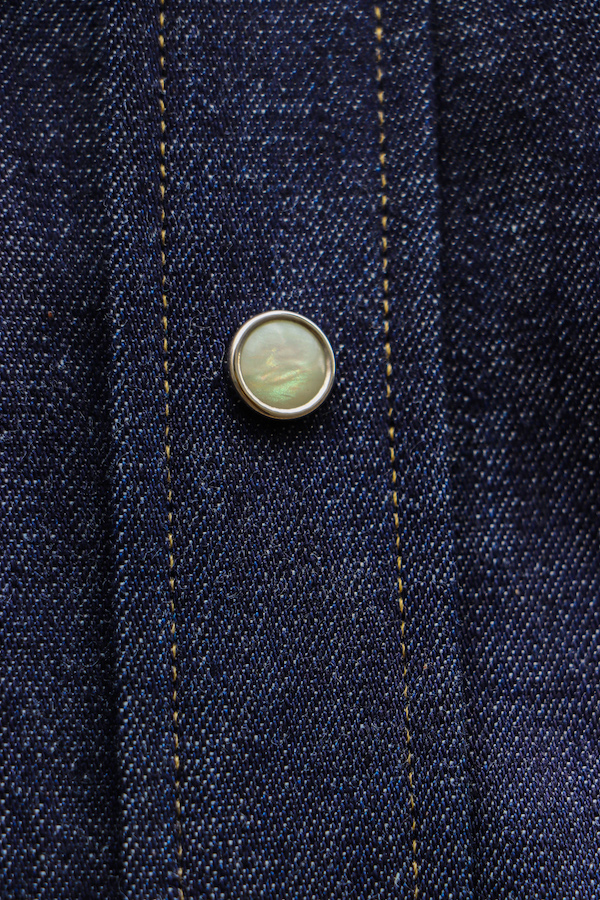 代名詞であるウエスタンヨーク。スナップ仕様のシェルボタンを使用。フロントには2つのフラップポケット。イエローステッチ。