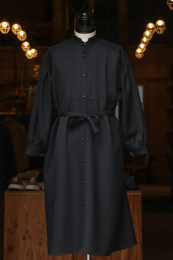 フロントは前開きもできるようになっており、ウエストベルトの締め方によっては様々な着こなしが浮かぶ一枚です。