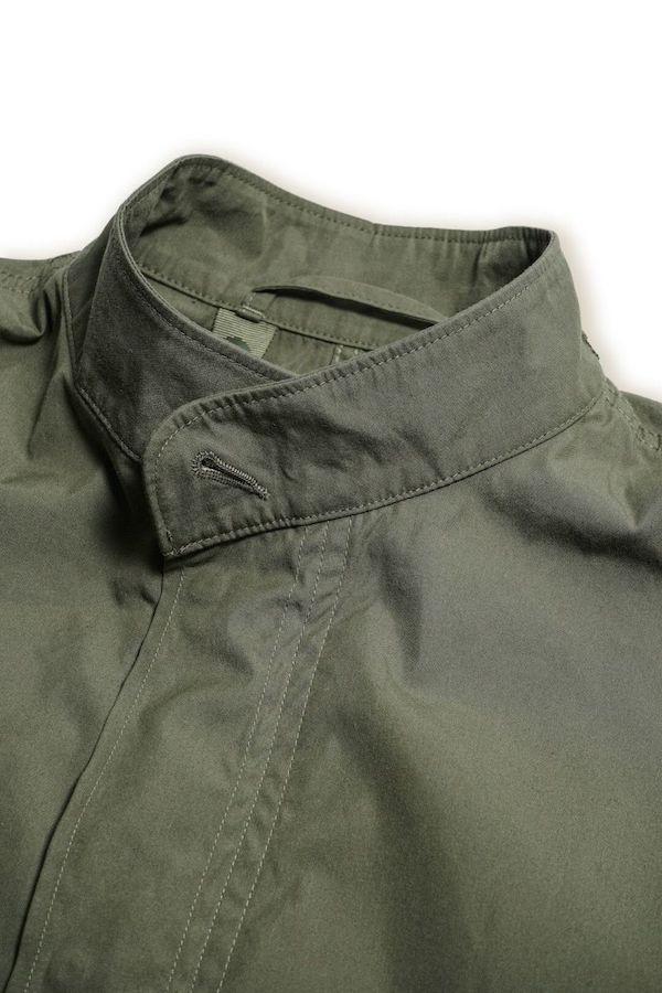 生地は、数年のテストを経て完全オリジナルで開発いたしました。ミルスペックと全く同じ「コットン80% / ナイロン20%」の混紡率でしか出せない絶妙なミリタリーカラーの色味を再現しています。通常用いられる「生地染め」ではなく、糸から染めた「先染め」糸を織り上げることで、着用を繰り返しても褪色しづらく、尚且つデッドストックのような生地のハリ感を実現。