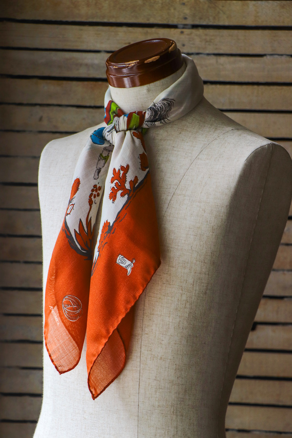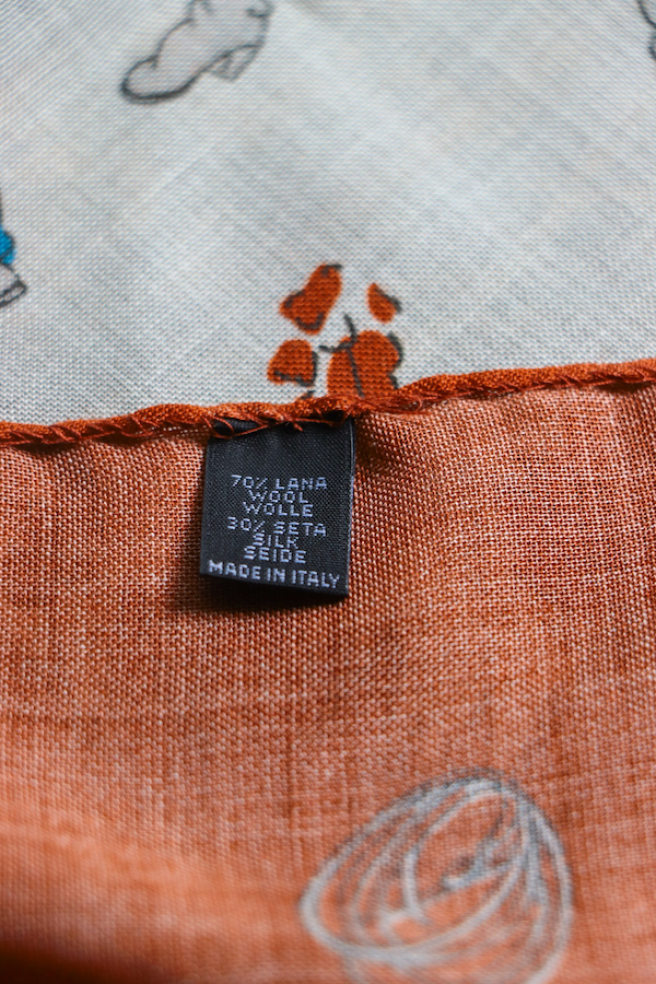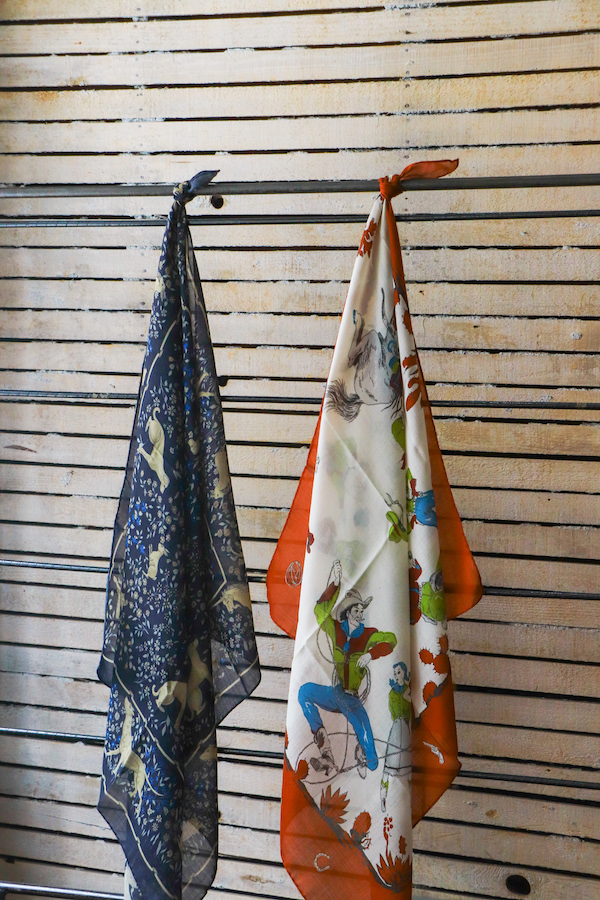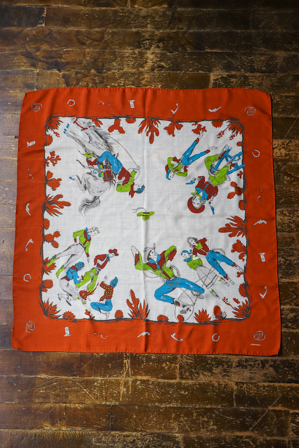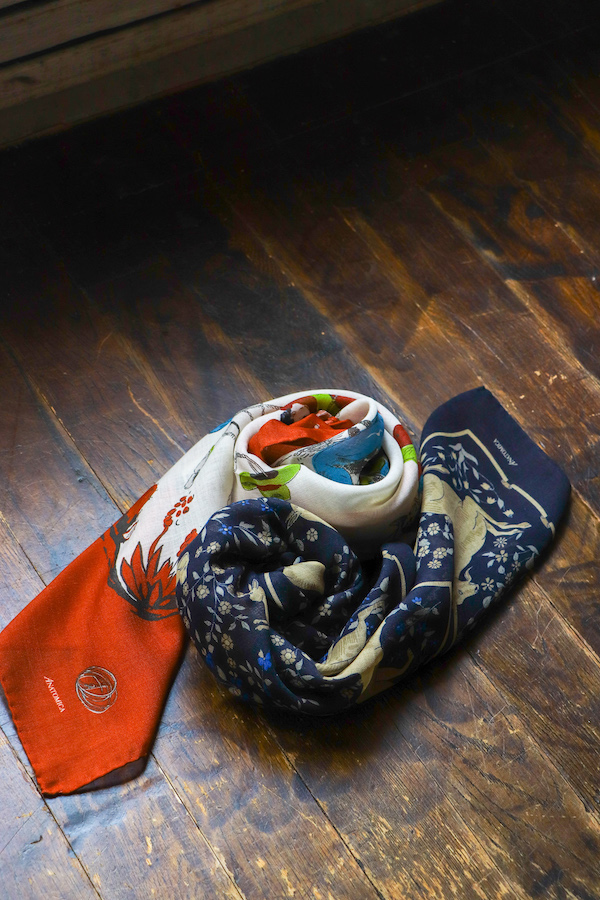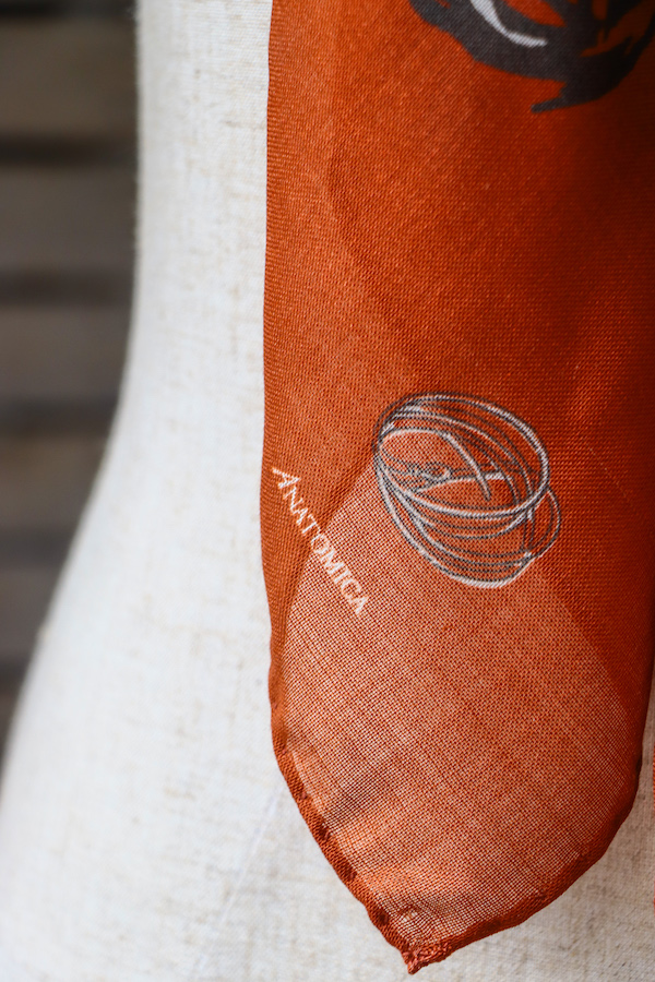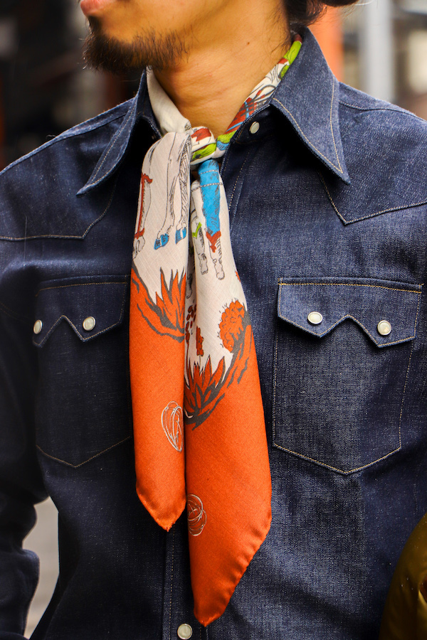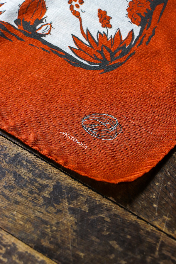 ピエールが所有しているスカーフをオリジナルソースとしてANATOMICAの為だけに特別に”絵型”から作成。珍しいスクエア型で、WESTERNをモチーフにしたスカーフで4つの角にはそれぞれ異なるデザインのイラストが描かれているANATOMICAでしか出会うことのないスカーフである。素材はウールとシルクの混紡のため、長いシーズンで愛用できる。