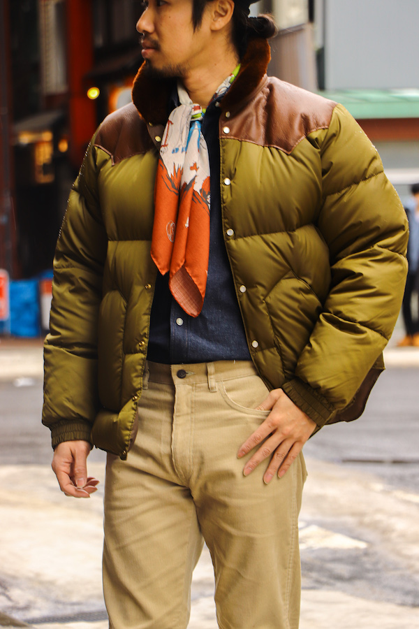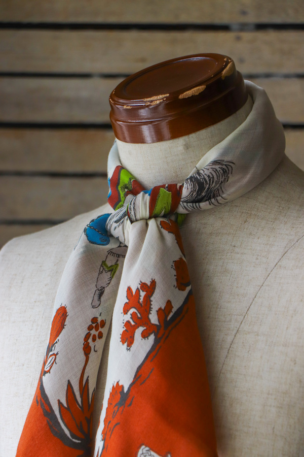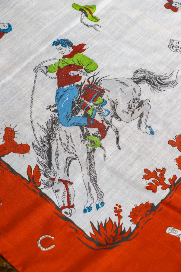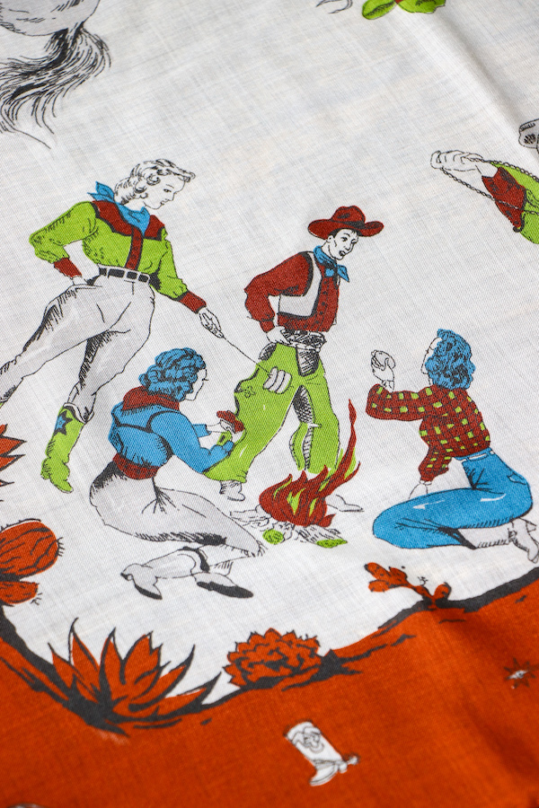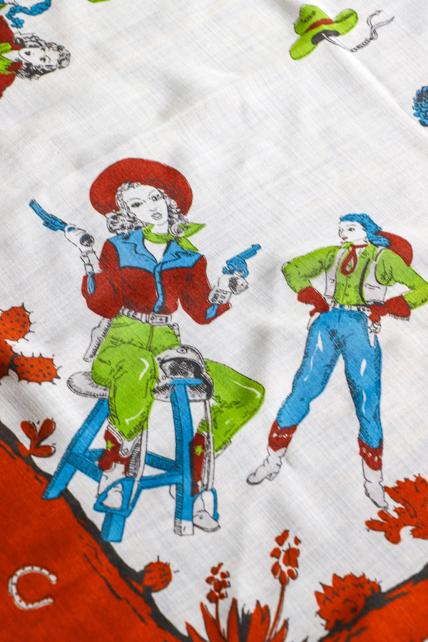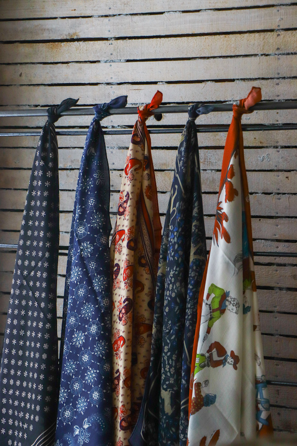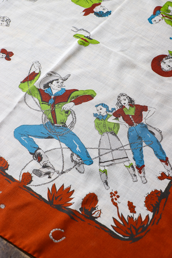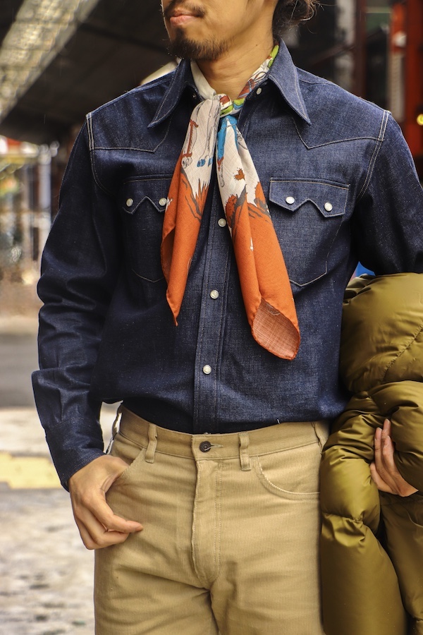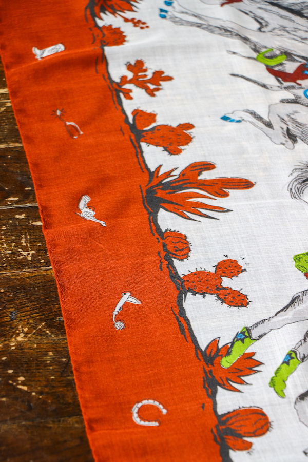 ピエールが所有しているスカーフをオリジナルソースとしてANATOMICAの為だけに特別に”絵型”から作成。珍しいスクエア型で、WESTERNをモチーフにしたスカーフで4つの角にはそれぞれ異なるデザインのイラストが描かれているANATOMICAでしか出会うことのないスカーフである。素材はウールとシルクの混紡のため、長いシーズンで愛用できる。