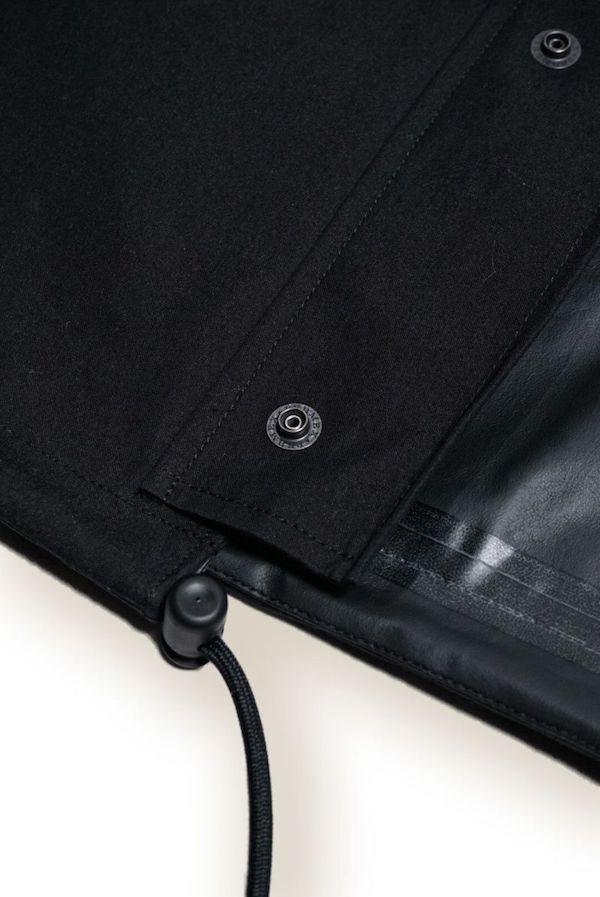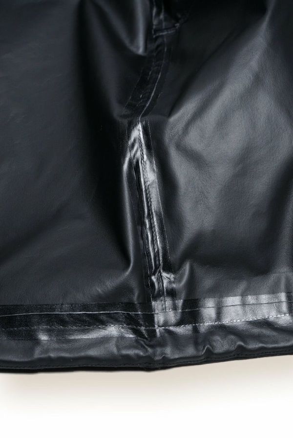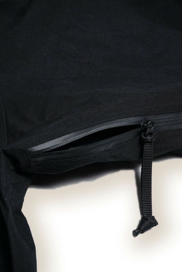 80/20クロスの表面に超撥水加工を施し、裏面にレインギアに使用される防水シートを貼り合わせ、その上からウレタンコーティング(メンブレン)加工を施しています。 これにより、見た目(表地)はコットンの質感を感じさせるクラシックな風合いでありながらも、ギアのような防水スペックを持たせることに成功。
