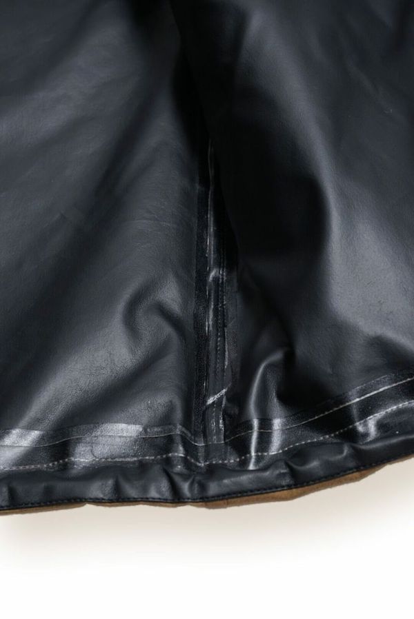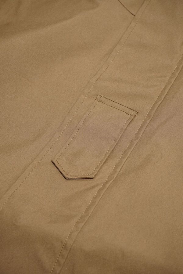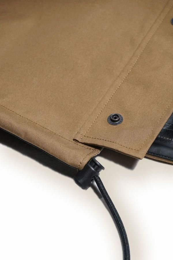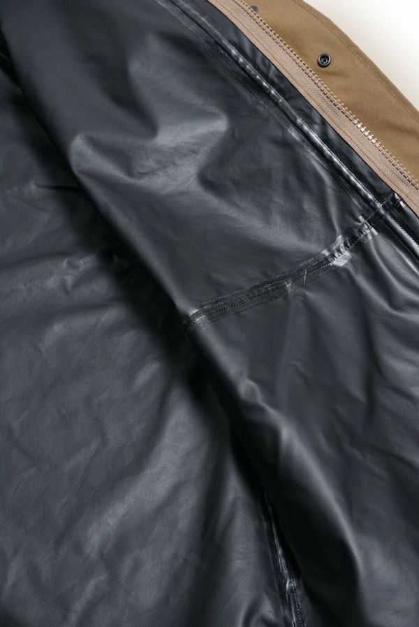 80/20クロスの表面に超撥水加工を施し、裏面にレインギアに使用される防水シートを貼り合わせ、その上からウレタンコーティング(メンブレン)加工を施しています。 これにより、見た目(表地)はコットンの質感を感じさせるクラシックな風合いでありながらも、ギアのような防水スペックを持たせることに成功。