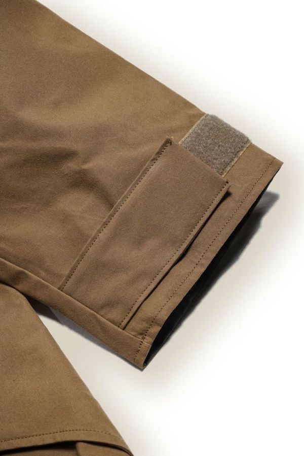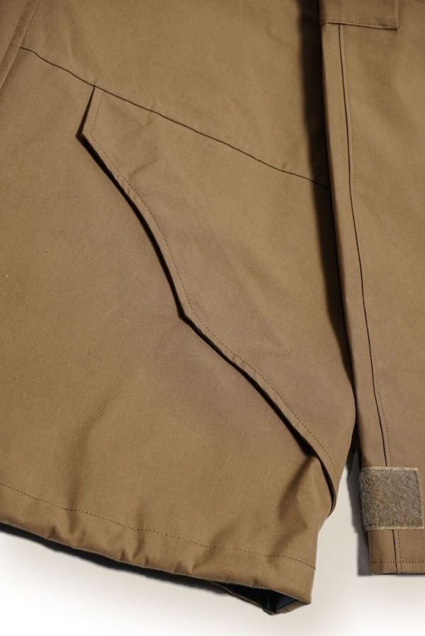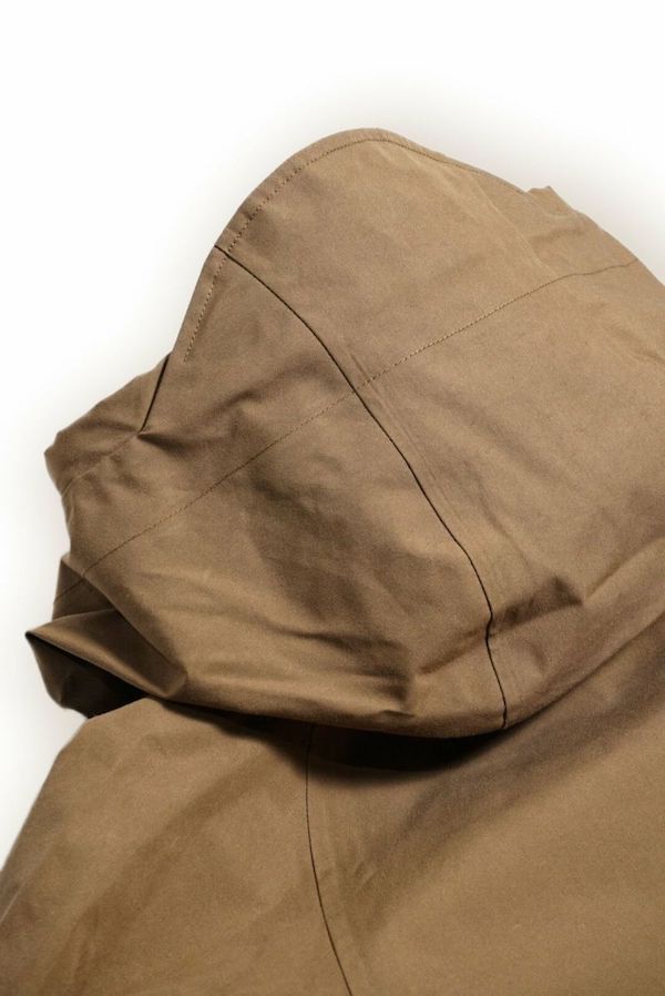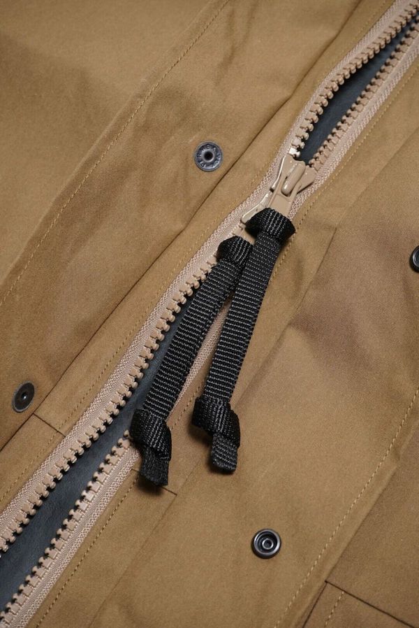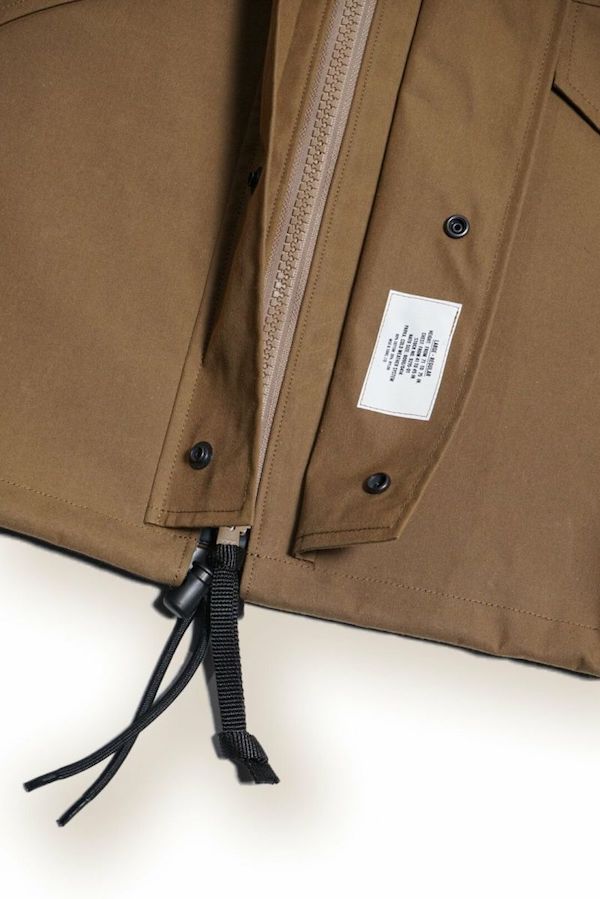 あえてこの80/20クロスをECWCSパーカに選んだのは、クラシックなアメリカンミリタリーをルーツにした素材であり、なおかつ経年変化を楽しめる素材であるから。そして、日本の高い技術力によって、コットンナイロン素材にも防水メンブレン加工を施すことが可能になったからです。
