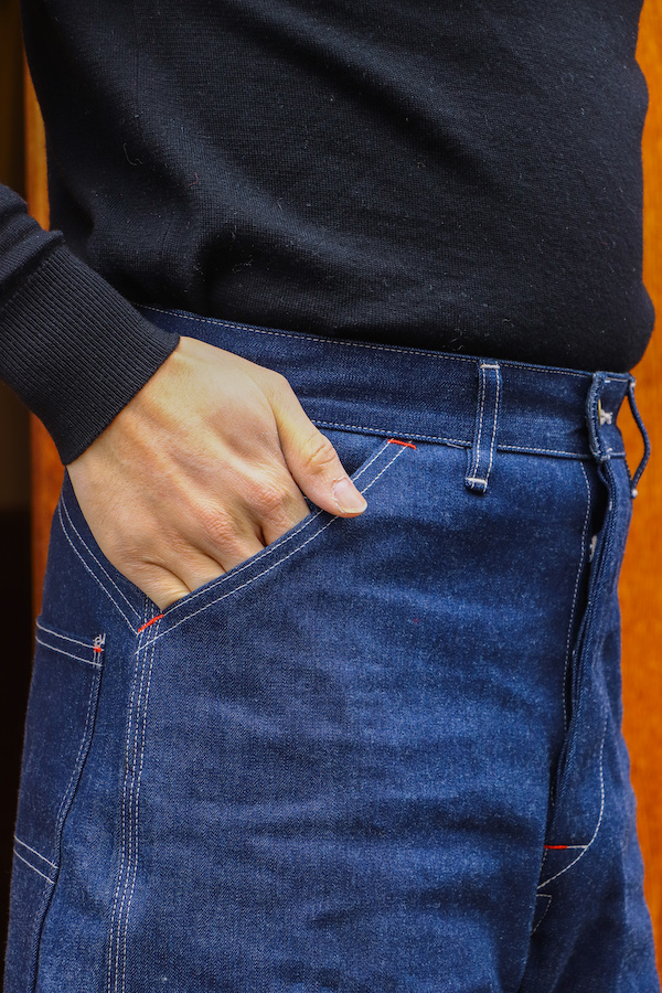ワークウェアらしい3本ステッチ、フロントはスラッシュポケットで、右側にはコインポケットを配置し、大き目のヒップポケットも特徴。