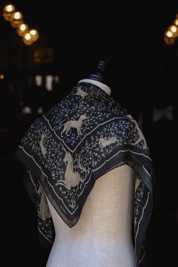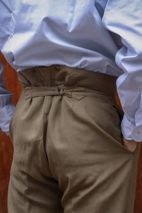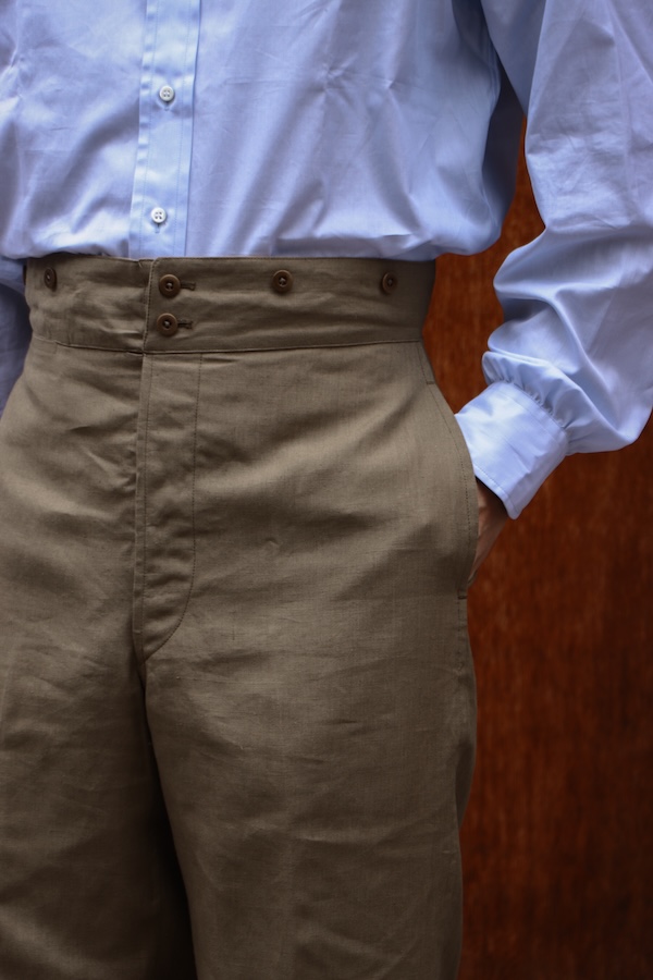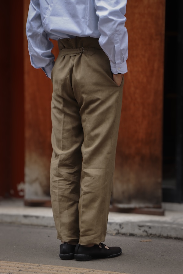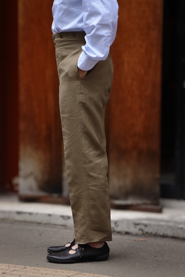 18世紀より存在するパリ郊外のブローニュの森近くバガテル公園でのガーデニング作業をするための"ワークパンツ。世界最古のデパートと言われる"BELLE JADENIER"製のものがモチーフとなっている。薄手だがハリのあるリネン100%の生地。