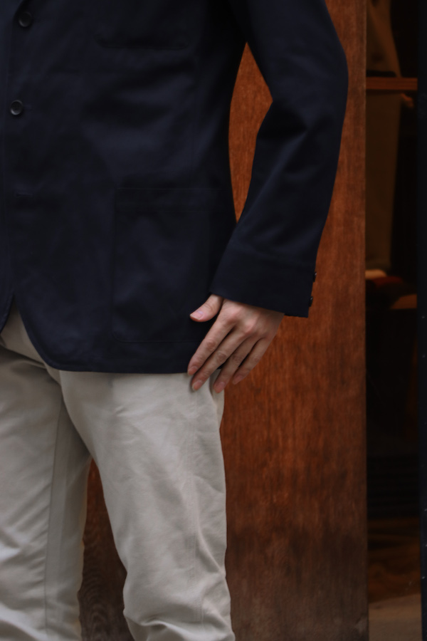 生地には英国老舗ミルのFOX BROTHERSのコットンツイルを採用。滑らかな生地感と適度な光沢がありジャケット単体での使用はもちろん、セットアップであればビジネスシーンでも活用いただけます。