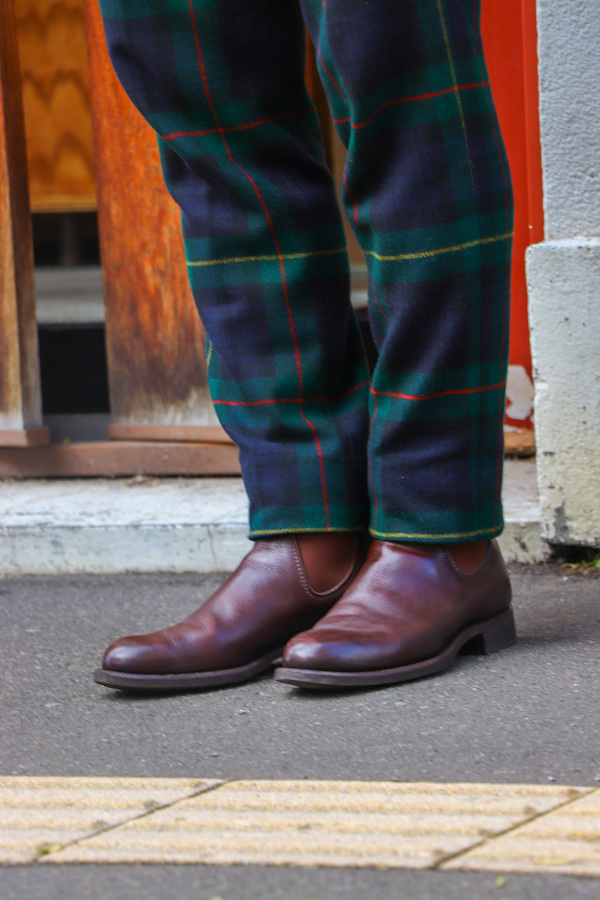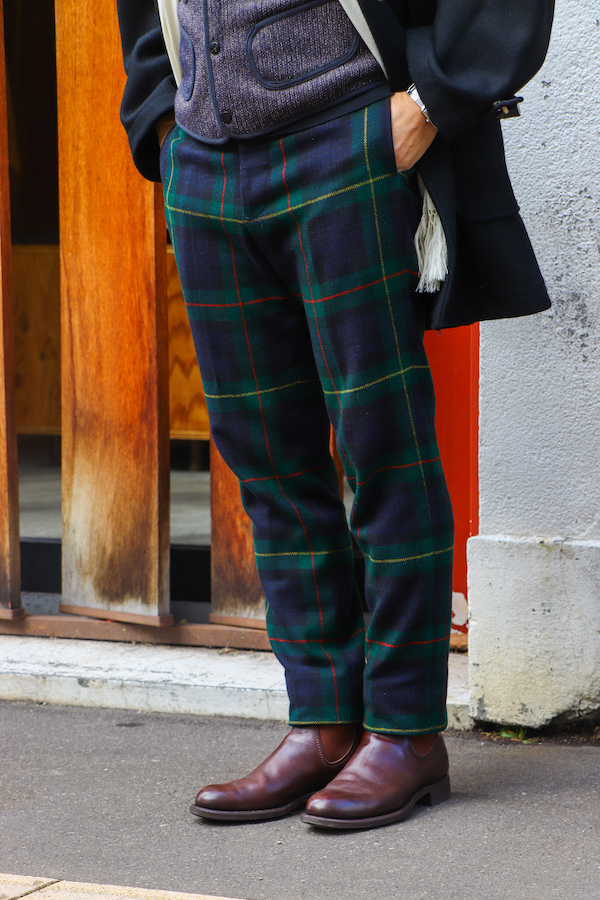 アナトミカ 創始者、ピエール・フルニエが「世界一美しい」と豪語する"TANGO PANTS(タンゴパンツ)"スコットランドのセレモニー用トラウザーズを元に、テーラーメイドにて、1mm単位で拘り抜いたアナトミカ オリジナルのシルエット。クラシックなサスペンダー用ボタンが施されているが、サイドのアジャスターによって調節が可能。赤と黄のラインが特徴的な"スチュワート家"のタータンチェック柄。ウール100%生地。