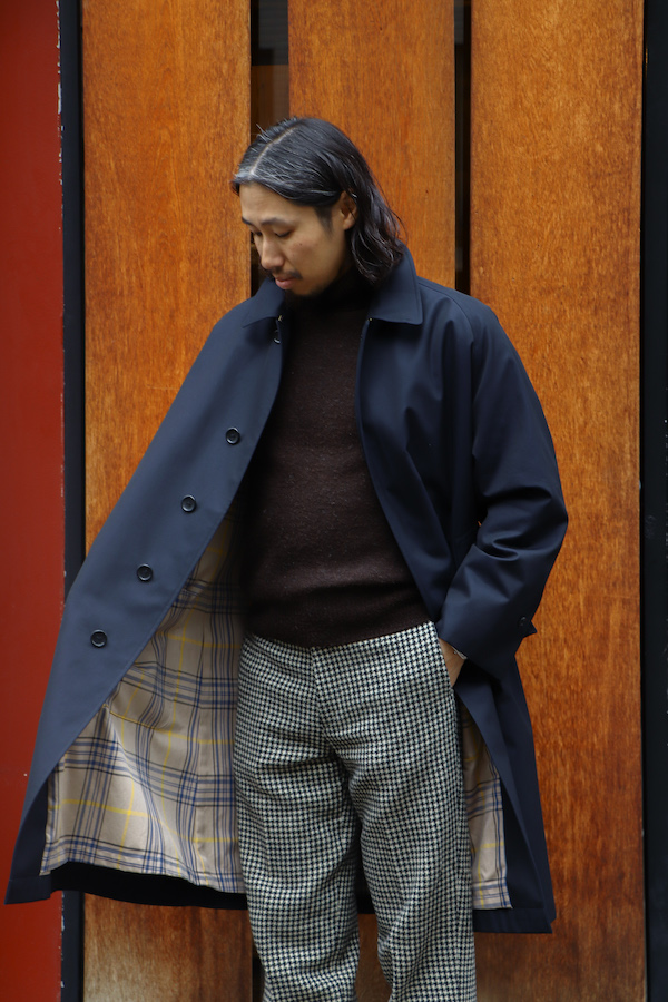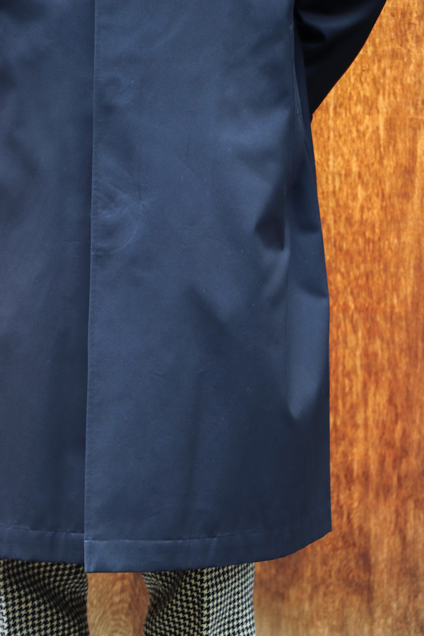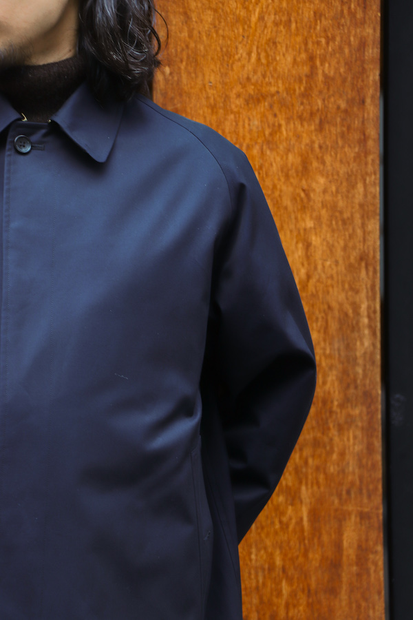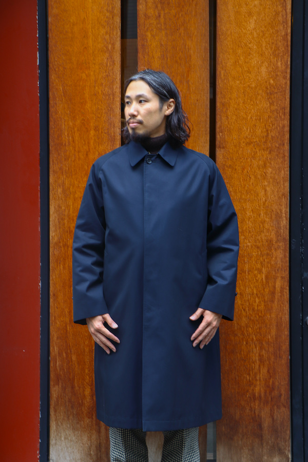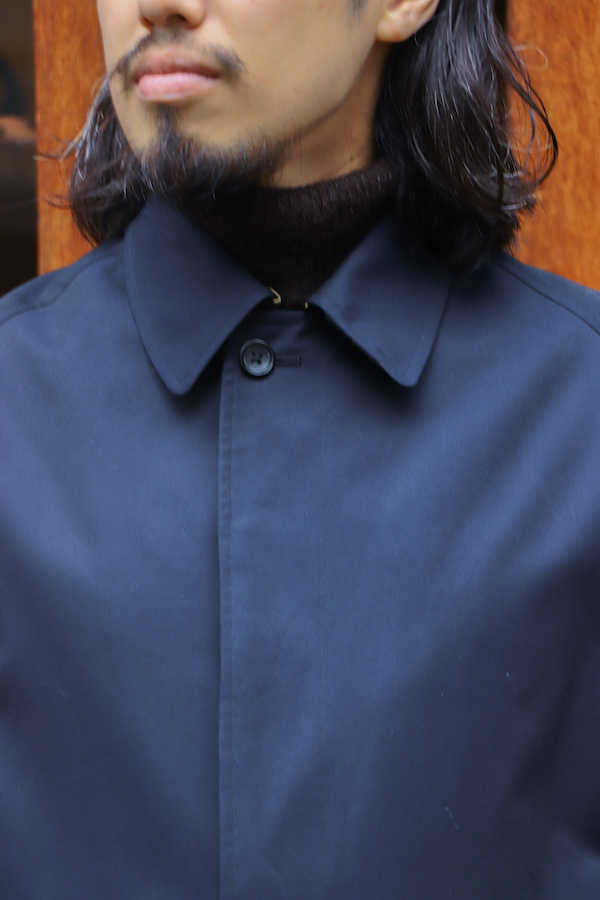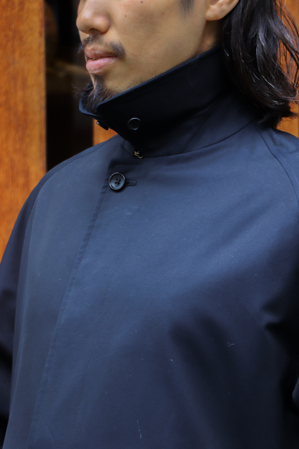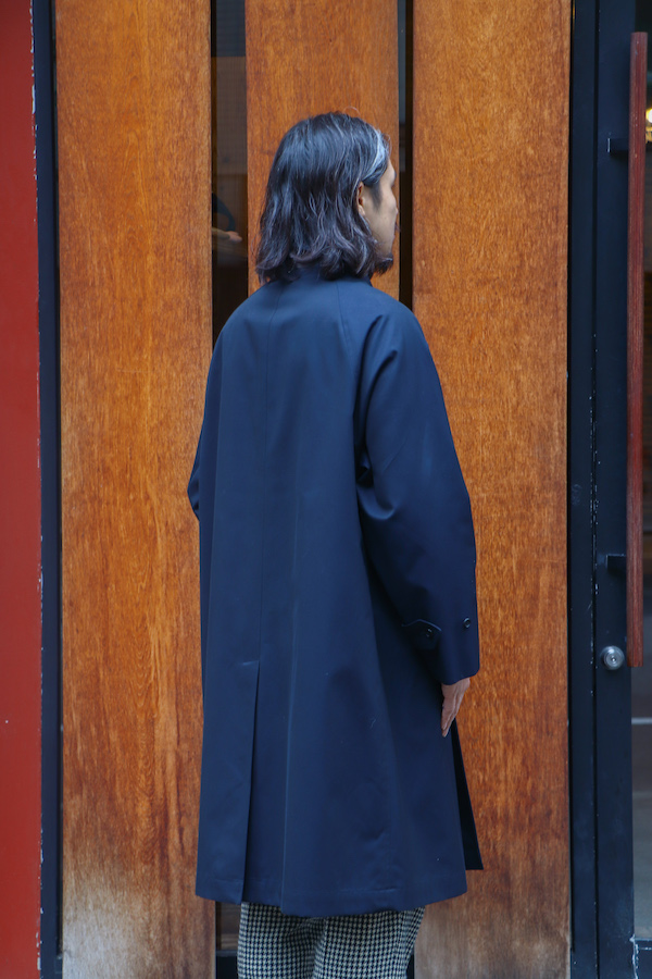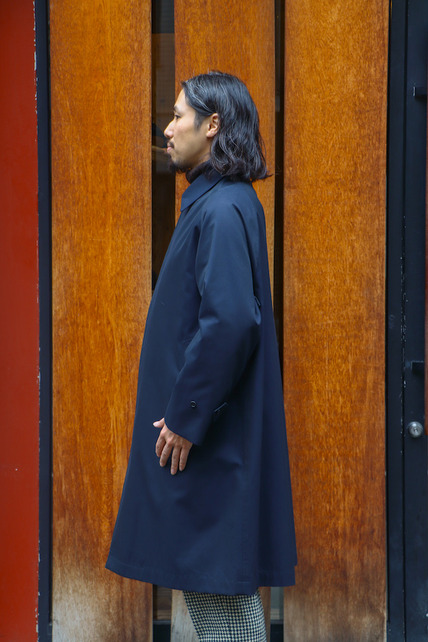 通称"シングルラグラン”と呼ばれる、筒状の1枚袖のラグランスリーブが特徴のコート。中に着込んでも余裕のあるアームホールの広さと、揺れ感の出るたっぷりとしたAラインのシルエットが特徴。いつの時代にも廃れる事の無い永遠のベーシック。高密度に打ち込んだコットン100%の"GABARDINE"を使用。撥水性の高い生地。
