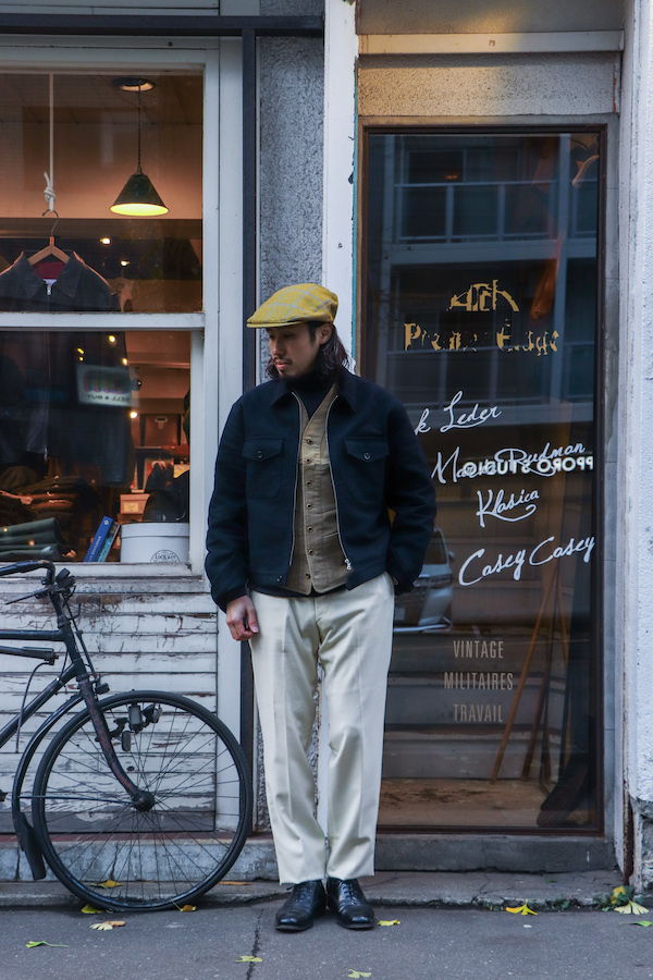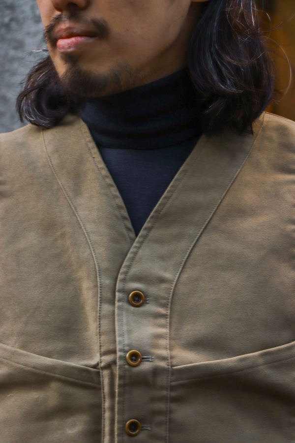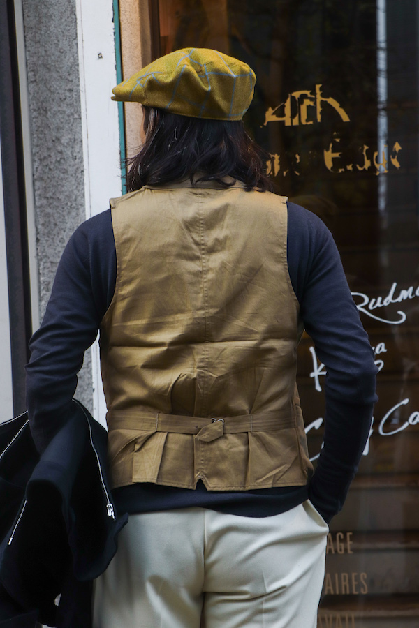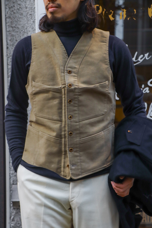 【ANATOMICA FRENCH GARMENTS /アナトミカ フランス製】20世紀初頭に"Prince de Sagan(サガン伯爵)"がハンティングスポーツに興じた際に着用していたベストを元にデザインされた事が名前の由来。前面に見られる6つのポケットは機能性に富んでいるが、当時は貴族の娯楽として楽しまれていた狩猟という事もあり、見た目はエレガント。生地はコットン100%の"ENGLISH MOLESKIN"を使用。