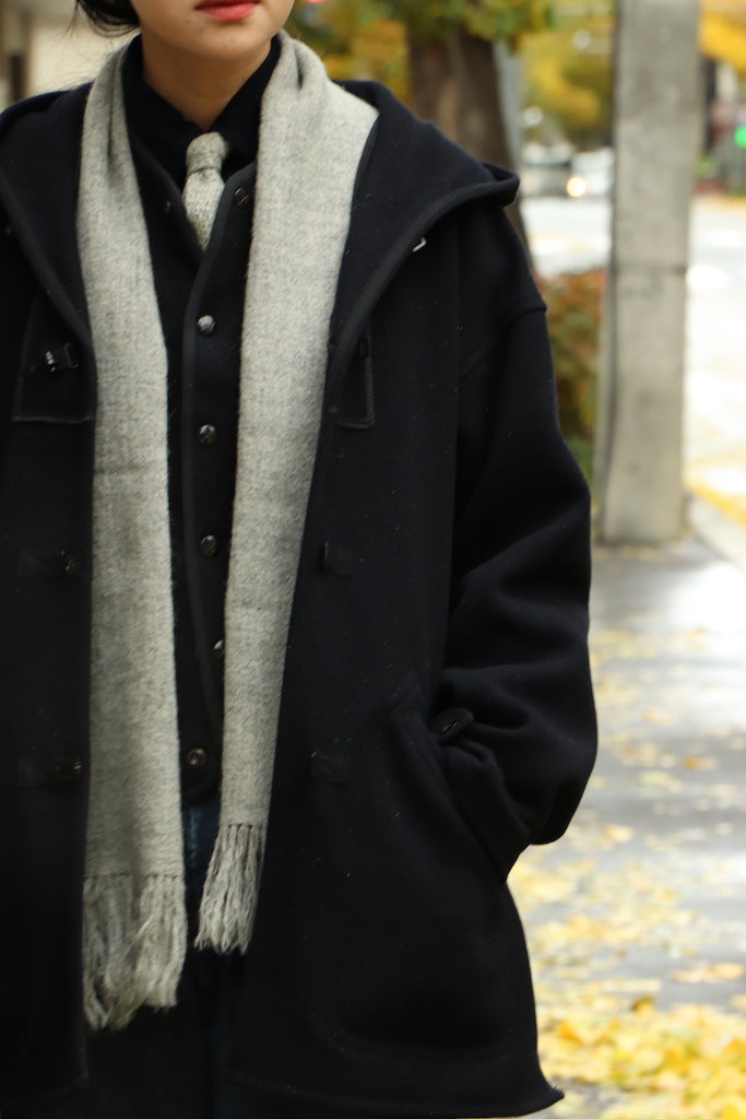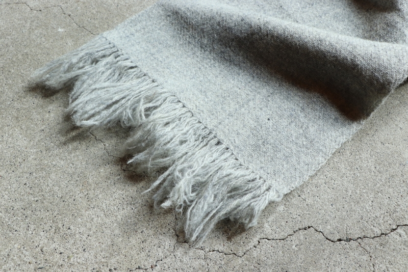 シェットランド諸島に生息する羊から取れる100%純粋なシェットランドウールを使った、日本国内のとある地で織られたホームスパンのスカーフ。ホームスパンとは、HOME (家) SPUN (紡いだ) という言葉どおり、原毛から手染め、手紡ぎ、手織りによって仕上げるイギリス発祥の毛織物のこと。現代では非常にアナログな方法ではありますが、機械では決して表現出来ない雰囲気は手作業の温もりを感じます。