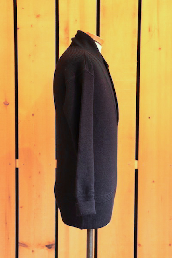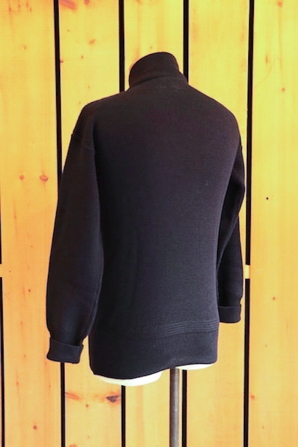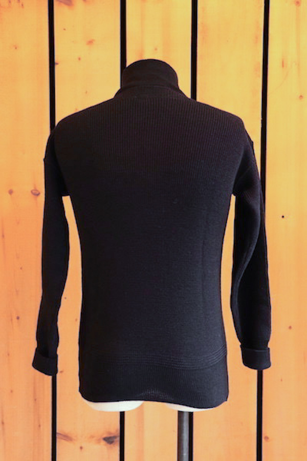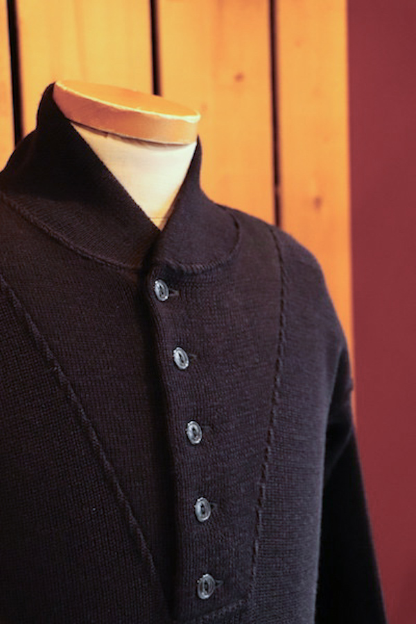 毛足の長い羊毛だけを選抜して引き揃え、短い羊毛を何度も梳りながら取り除いた「梳毛」が使用されています。出来上がった糸は太さが均一でスラリとしており、表面が滑らかになるのが特徴。1940年代に米軍に支給されていたセーターがオリジナル。男らしく、無骨な格好よさのあるセーターです。V字の切り替えと、胸元のボタンが目を惹くヘンリーネック。ボタンは上まで閉じても良いですし、スカーフをしたり、シャツの襟を覗かせたり、クルーネックのTシャツを合わせたり…とボタンの開け具合によって印象が変わるのが特徴。