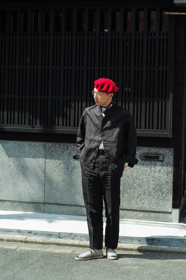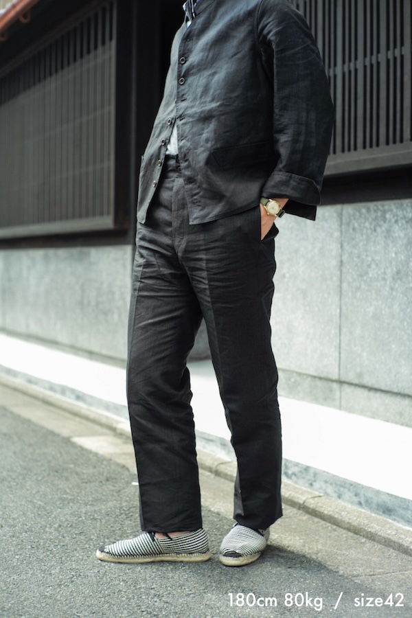18世紀より存在するパリ郊外のブローニュの森近くバガテル公園でのガーデニング作業をするための"ワークパンツ。世界最古のデパートと言われる"BELLE JADENIER"製のものがモチーフとなっている。薄手だがハリのあるリネン100%の生地。同生地のジャケット・ベストとセットアップ可。